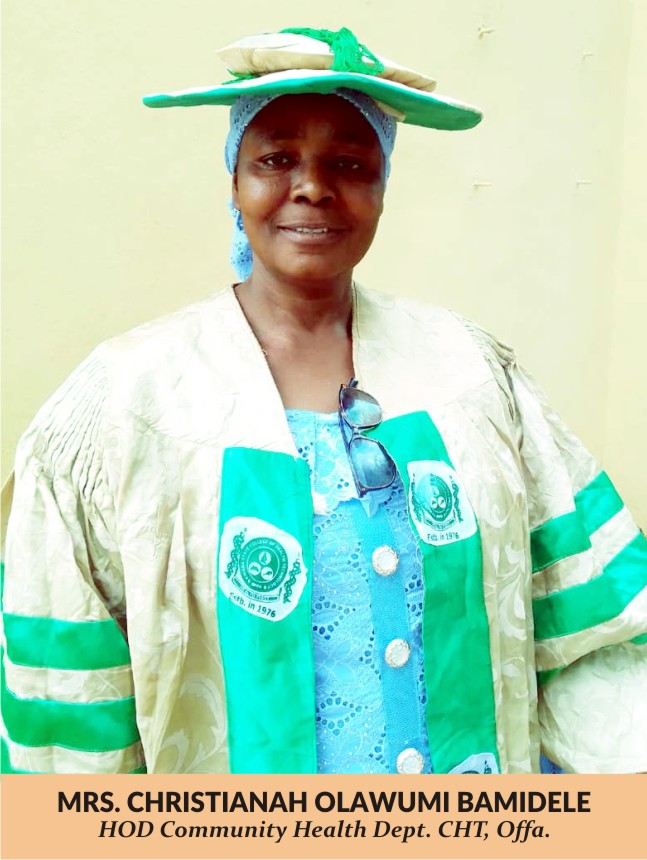 The HOD Community Health Department, College of Health Tech, Offa, Mrs. Christianah Olawumi Bamidele, integrity and diligence personified, expressed her satisfaction with the successful completion of the programme and conduct of graduands, “the inductees has toiled day and night to arrive the port of success by making today’s programme an epoch making event, they can compete favorably with their counterparts anywhere in the country, the Community Health Scholar assured.
