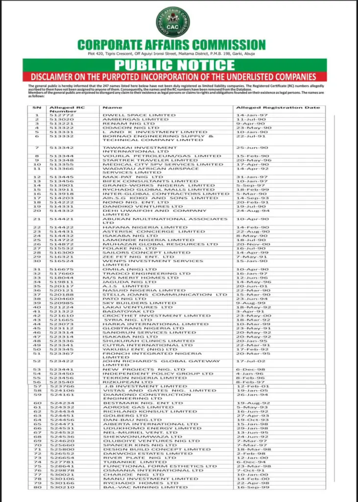 The Corporate Affairs Commission (CAC) has a issued a disclaimer on the purported incorporation of some listed companies, THE PRIME NEWS reports.