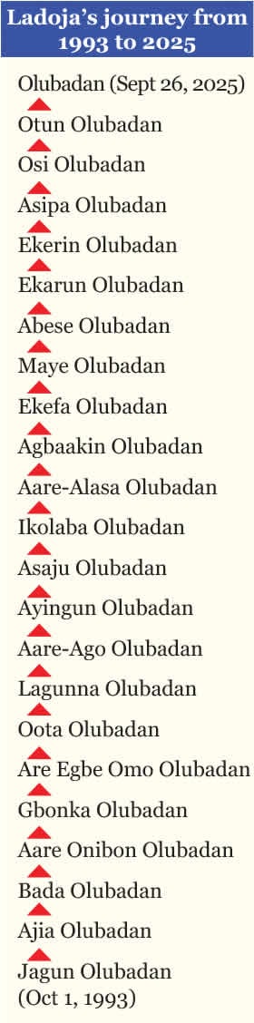 For the Otun line from where Ladoja emerged, the movement is from Jagun Olubadan – Ajia – Bada – Aare Onibon – Gbonnka – Aare Egbe Omo-Oota – Lagunna – Aare Ago – Ayingun – Asaju – Ikolaba – Aare Alasa – Agba Akin – Ekefa – Maye – Abese – Ekarun Olubadan – Ekerin Olubadan – Ashipa Olubadan – Osi Olubadan – Otun Olubadan and eventually Olubadan.