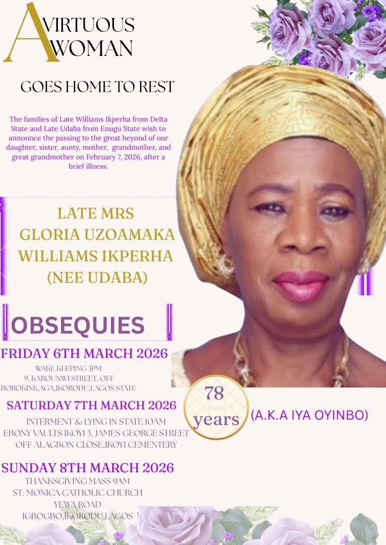 Nollywood actress Faithia Balogun has announced the burial arrangements for her mother, Gloria Williams.